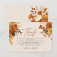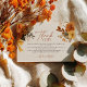 Varm, jordnära och fylld med tacksamhet – det här bröllopsfest-kortet med hösttema har handmålade vattenfärgblommor i rika hösttoner, elegant serif- och script-typografi och ett hjärtligt meddelande. En mjuk beige bakgrund ger en mysig, boho-charm, medan gyllene band och säsongens lövverk skapar en genomtänkt souvenir som dina gäster kommer att värdesätta. Perfekt för höstbrudar, rustika bröllop eller mysiga bröllopsfester. Redigerbar och enkel att matcha med hela din ”Förälskad”-festsvit.