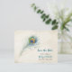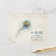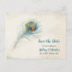 Bohemiskt bröllop spara datum vykort med påfågel fjäder och turkos text. Perfekt för eleganta boho bröllop och andra vintage-inspirerade evenemang.