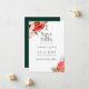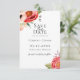 Vattenfärgarrangemang för elegant bohemian stil med blommigt med botaniskt löv i trendigets nyanser av rosa, grönt, violett och persika, Bröllop spara datum Card. Kortets baksida har solid emerald grönt färg.