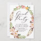 Boho-inspirerad studentfest med vattenfärgfjädrar och blomkrans med rosa tillbaka färg. Elegant och viskhet, perfekt för vår studenten. Den här designen är tillgänglig för andra händelser.
