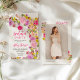 En söt, girly Bohemian rosa ros, vildblommor, sommarklass vår 2025 studentfest med söt pastel rosa ros, vild land blommor i boho lavender, persiko, korall, röd, grönt löv, fern och mer, med en borstad manustypografi på en elegant som kan redigeras vit bakgrund. Lägg till fotot längst bak.
