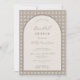 En möhippa med en av årstidernas bästa utskrifter - en öppen rakvattavla i mönster och i ett bågformat. På baksidan finns ett enkelt och modernt par monogram.