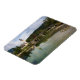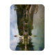 Rektangulär fotomagnet med ett Bohinj sjö-landskap med lugn vatten och reflektion av St. John Baptist-kyrkan och stenbron i Ribcev Laz, Slovenien, i början av höstsäsongen.