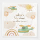 Cute whimsical airplane pilor baby shower theme, design feature green and yellow watercolor vintage helicopter over the the sky decor with boho watercolor neutral cloud, stars, sun, balloon rainbow and the "Adventure Awaits" text, perfect for baby boy and girl baby shower. you can customize your own text and color.
