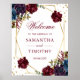 Elegant Boho akvarell röda, lila och blå vinterblommor och löv design med guld geometrisk ram