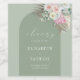 Den här moderna boho-designen har en sage grönt-bågform som dekoreras med en lush rosa och vit tropisk blommigt buquet accentuerad med torkad handflatan löv och eukalyptus sprickor på blekens grönt. Ord "cheers" visas i ett vitt skript i elegant. Anpassa etiketten med en kort skiss som du kan välja, tillsammans med namnen på bruden och brudgummen samt plats och datum för bröllop.
