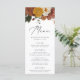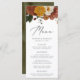 Höstmenyn i Rustic bröllop, som innehåller en övre gräns av vattenfärgade blommor och grönska i muterat autoinskt färg av elfenben, orange, senap guld, oliv grönt, dammigt ro och brunt. Anpassa med namn, datum och menyinformation för bröllop. Baksidan av menyn blommigt bröllop har en oliv grönt vattenfärgsdesign för riken. Designad för att samordna med vår samling i bröllop vid Blommigten för hösten.