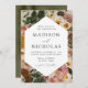 Elegantens höstbröllopsinbjudningar med uppgifter om bröllop som är inkapslade i ett geometriskt ram omgivet av vattenfärgblommor och grönska i muterat autoinalt färg av elfenben, orange, senap guld, oliv grönt, dammigt ro och brunt. Bröllopet för fallblommigt bjuder tillbaka till visning av en riks oliv grönt vattenfärgsbakgrund. Designad för att samordna med vår samling i bröllop vid Blommigten för hösten.