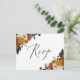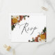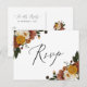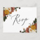 Elegantens vykort för blommigt på hösten med OSA av "OSA" i vackra kalligrafskript med blomsterbuketter och löv i jordtonsnyanser av elfenben, marigold, burgundi, dammig ro och oliv grönt. Anpassa baksidan av vykortet för bröllop OSA med önskat svarsdatum, acceptera/avböja formuleringar, måltider och returadress. Designad för att samordna med vår samling i bröllop vid Blommigten för hösten.