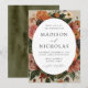 Elegantens höstbröllopsinbjudningar som innehåller uppgifter om bröllop som förvaras i ett ovalt ram, omgivet av vattenfärgblommor och grönska i muterat autoalt färg av elfenben, orange, senap guld, oliv grönt, dammiga ro och brunt. Bröllopet för fallblommigt bjuder tillbaka till visning av en riks oliv grönt vattenfärgsbakgrund. Designad för att samordna med vår samling i bröllop vid Blommigten för hösten.