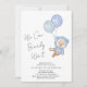 Boho pojke duschinbjudan med en söt vattenfärgsillustration av en blå nalle flytande ballonger och "Vi kan vänta tidigt" i ett handskript med kalligrafi.