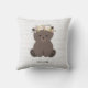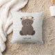 En kudde med ett träslag med ett temat mönster som illustrerar en björn i baby över en grått-träbakgrund. Anpassa namn. Björnen bär en blomma krona.