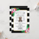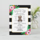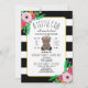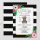 En baby shower-inbjudan med en illustration av en björnunga som bär en rosa blomsterkrona. Anpassa texten. Bakgrunden är ett svart-vit-randigt mönster.