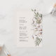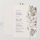 Boho Blommig Bröllopsinbjudan. Chic och modern, denna stiliga bröllopsinbjudan har vackra handmålade akvarelltropiska krämfärgade och elfenbensvita blommor med salvia gröna palmlöven arrangerade som en trendig bukett. Bakgrunden är beige och texten är svart. Baksidan av inbjudan har samma konstverk. Hitta matchande föremål i Tropical Boho Wedding Collection.