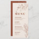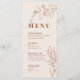Denna meny kännetecknas av boho-stil, blomsterkonst, neutral jordnära och beige färger, med en blandning av olika typsnitt, ofta i olika storlekar, för att skapa ett unikt, eklektiskt utseende som gör dessa menyer till en naturlig estetik.