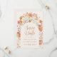 Meddela din speciella dag i stil med den här Wildblomarch Terracotta beige-gräddbröllopet Spara datumet. Den här designen blandar autodiagram med sofistikerad elegant och har handmålade vildblommor med vattenfärg som är ordnade runt en fin båge. Riken med bränd orange, terracotta, lila, gult, korall, bränt antal, persikor och mjuk rosa fångar upp fallets värme och skönhet. Elegantens skript parad med modern typografi ger en förfinad beröring, medan de visuella blommigtarna ger en personlig, boho-känsla. Konstverk och design av konstnären Catherine Sweetman, som sparar datumet, anger tonen för en mysigt, romantisk gäst i firande och ge som en charmerande förhandsvisning av vad som är för komen.