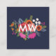 Monogrammat kvadratiskt affärskort på mörk blått för en insida-designer, händelsestilist, makeup-artist eller liknande, som innehåller ett handritat blomsterbouquet i orange, rött, rosa och vitt.