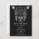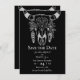 Det här Spara datummeddelandet från Bröllop har ett bohemiskt stamskalle som är dekorerat med blommor och fjädrar som alla är gjorda i svarta och vita nyanser. ^