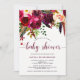 Den här inbjudan till babyduschen innehåller söt vattenfärgblommor i klara skuggor av Marsala, vin, djup grönt, rött och lila och matchar modern typografi.