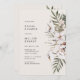 Boho Blommigt Inbjudningskort för möhippan. Chic och modern, denna snyggt inbjudningskort för möhippan har vackra, handmålade tropiska kräm och elfenbensblommor med sage grönt handflatan löv arrangerade som en trendig bouquet. Bakgrunden är beige och texten är svart. På baksidan av inbjudan finns samma teckningar. Hitta matchande objekt i samlingen Tropical Boho Bröllop.