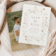 Boho Blommigt Ram Wildbloms Bröllop spara datum-meddelande. Det finns ett foto på baksidan. Klicka på knappen Redigera om du vill anpassa designen.