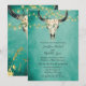 Boho-bröllopsinbjudan innehåller en blommigt ko skalle med söt gult blomsträng ljus på en turkobakgrund med guld. ^