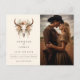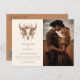 Boho Blommigt Skull Westernt Foto Spara datuminbjudan/annonsering vykort - Meddela ditt mycket speciella datum med en liten charm och bohemisk elegans med vår Boho Blommigt Skull Westerna Bröllop spara datum. Den här fängslande inbjudan/annonseringen blandar en koskalles edgy allure med jordtonsblommornas mjuka skönhet och skapar en slående kontur som perfekt fångar kärnan i din unika union. Längst fram i inbjudan finns ditt favoritfoto och en vackert utsmyckad ko-skalle går i centrum, symboliserar styrka, motståndskraft och vilda western anda. Omger det, en känslig matris av jordtonsblommor som tillför en mjuk, boho romantisk beröring till den robusta bakgrunden. När du stänger inbjudan visas en underbar överraskning - baksidan av inbjudan innehåller en QR-kod för din bröllop-webbplats och/eller dina RSVP:er. Vår Boho Blommigt Skull-inbjudan till Westerna bröllop, med sin blandning av bohemiskt flluft och western charm, anger tonen för ett oförglömligt firande i kärlek, enighet och naturens tidlösa skönhet.