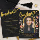 Grattis till din student dotters examen med en snyggt och hjärtlig studentfest till hennes studentfest! Denna moderna inbjudan till Studentfest för i guld och svart skript är designad för att fånga upphetsningen och glädjen hos denna speciella milstolpe. Med kalligrafi av elegant guld och en vismisk vattenfärgsbåge på en svart bakgrund avslutar den här inbjudan snyggt charm och firande. På framsidan framhävs dotterns detaljer om namn och party i vackert manustypografi i guld med svart bakgrund, medan baksidan innehåller ytterligare händelseinformation i guld moderna typografi. Den här inbjudan innehåller en lättläst fotomall som gör att du kan anpassa den med ett omhuldat foto av student och skapar den speciellt. Det här unika kortet är perfekten till att den upphetsning som hennes högskoleexamen och vänner och familj i inbjudan går med i festligheterna. Ett vackert sätt att fira hennes otroliga prestation och början på hennes nästa kapitel!