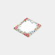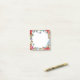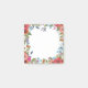 Blommigt fyrkantigt anteckningsblock efter det att det har färgats med blommor i olika färgnyanser av korallrött, orange och rosa. Lägg till initialer i mörk blått brev.