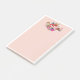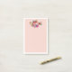 Blommigt Postit noterar med initialer i modern vit brev en bukett med färgstarka blommor och grönska mot en rosa.