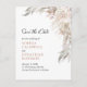 Boho Blush Rosa Ros Torkade Palmblad Eukalyptus Elegant Lövverk Spara datum-kort... Vårt snygga blommiga Spara datum-kort har en bohemisk stil rosa ros i en kaskad av eukalyptus och fladdrande dammgröna blad. Baksidan av kortet innehåller din returadress, information om din bröllopswebbplats och en QR-kod grafisk mall som du kan ersätta med din egen grafiska kod. All exempeltext på båda sidor av kortet kan enkelt revideras med dina egna detaljer i personaliseringsmallen.