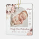 Nyfödd bebis födelsetal är fotojulprydnad. Utformningen har två foton, ett foto på framsidan och ett på baksidan. Visning nyfödd bebis. Födelsedatum visas längs sidan och baby namn och födelsestatus längs grund. Vackra blommigtar med boho bohemian stil rosa och vita blommor med accenter av brunbruna löv och handflatan löv. Blommigtarna är placerade i vackra bukettarrangemang för att skapa elegantens blommigt. Vattenfärgade blommigtar som målats med moodtologi.