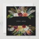 Den här snyggtens bröllopsinbjudan innehåller trendig vattenfärgblommor i burgnyans, marsala, orange, gult och vitt tillsammans med boho-fjädrar och många grönt-löv på en mörk, svart bakgrund.