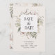 Boho Bröllop spara datum. Chic och modern, denna snyggt bröllop spara datum har vackra, handmålade tropiska krämer och elfenbensblommor, pampasgräs med sage grönt handflatan löv arrangerad som trendig. Bakgrunden är beige och texten är svart. Baksidan av inbjudan finns ett vackert mönster som lätt kan tas bort om man så vill. Hitta matchande objekt i samlingen Tropical Boho Bröllop.