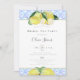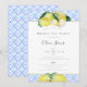 En boho, modern och trendig bröllopsinbjudan för tea party shower med gula citroner, handritade i akvarell och färgpennor över ett akvarellmönster av blå plattor inspirerade av Medelhavets traditioner. Anpassa den med namnet, datumet, tiden och alla detaljer. Modern kalligrafi för brudens namn och en guldram runt bakgrunden.
