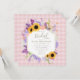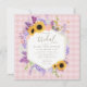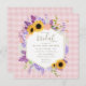 En rik, en elegant som är gjord av lush hydrangeas, solblommor, lavender, vete, baby andedräkt, ivy och ranunculus blommor ger en underbar illustration, som är handmålad i den digitala vattenfärgen, som dekorerar denna kvadratiska, rustiska elegant inbjudningskort för möhippan som har en rosa gingham-bakgrund och ett trendig boho ram. Romantisk och charmerande, det är ett underbart val för en lada-möhippa, en utomhusmiljö, en möhippa för trädgård eller trädgård eller någon form av rustika.