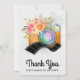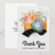 Tack vare party kan du få ett kort med en vattenfärgad illustration av en orange kamera med en blommigt bouquet och en svart och vit vågigt filmremsa. Baksidan har ett meddelande som du kan anpassa.