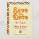 Boho chic 70, spara datumet bröllop. Kortfunktioner, stil-typografi i skuggor av varm orange, blommigtens accent och 70:s stil-mönster-stöd.