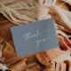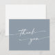 Det här boho-chicens dammiga blåa bröllop-tack är perfekt för ett minimalistiskt bröllop. Neutraltens ljusblå grått-moderna bohemidesign har enkel rustik kalligrafi med ett unikt men klassiskt stil. Baksidan av tackkortet är tom, så att du kan ge skrivan en tankeväckande anteckning.