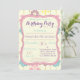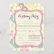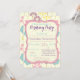 En mycket kvinnlig och klassisk boho chic (eller bohemisk) geometrisk retro blommig mönster i vårens nyanser av rosa, kräm, blå och grön, med blommor, hjärtan och några sicksackmönster. Visas på en anpassningsbar födelsedagsinbjudan