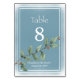 En del av den Himmelska samlingen för Kärlek-Orange och Cream Bröllop Suite som innehåller bröllop-relaterade evenemangsdokument och händelsemedjor med samma blommigt och stil. Samlingen innehåller flera iterationer för bord-kort, med vattenfärgade blommigtar och botaniska ämnen. I det här fallet är det ett vackert eukalyptus gren. En blå vattenfärg som tvättar mot bakgrund ger en modern boho och drömmande utseende som kontrasterar mot den vita texturerade dubblan ram och förstärker den vita typografin på kortet. Copyrights Sukis workshop, alla höger reserverade.