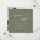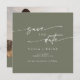 Den här boho-chicen, oliv grönt kvadratbild på baksidan, spara datumkortet är perfekt för ett minimalistiskt bröllop. Den mörk grönt skogstonin med modern bohemisk design har en enkel, rustisk kalligrafi med ett unikt men klassiskt stil. Anpassa ditt datum med namn, bröllop-datum, plats, fotot på förlovningen och din bröllop webbplats adress.
