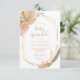 Trendiget Bho baby sprinkle-inbjudan innehåller en guld-geometrisk ram som dekoreras med vattenfärgade tropiska löv i handflatan och pampasgräs i nyanser av beige, persika och muterad grönt. Anpassa beige-texten med din skrynklingsinformation i baby. Den omvända sidan är en koordinerande skugga av fast persikofärgat beige.