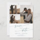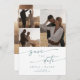 Den här boho-chicen, teal och vit QR-multifotokod, som sparar datumkortet är perfekt för ett minimalistiskt bröllop. Den blå grönten och den vita, moderna bohemiska designen har en enkel, rustisk kalligrafi med ett unikt men klassiskt stil som påminner om kuststranden och en sommarhavskyrka. Anpassa datumet med namn, bröllop-datum, plats, foton med fyra förlovningar och en QR-kod som länkar till webbplatsen för bröllop.