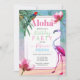 Rosa, blå och en blandning av tropiska färger frammanar bilden av en akvarell rosa strand som tonar ut i en akvarell hav och himmel omgiven av tropiska blad. Baksidan är prydd med ett vintage palmträd och ananasbuske för att fullborda looken. En panel med guldfärgad kant på framsidan överlagrar den tropiska bakgrunden för att rama in dina "Aloha" födelsedagsfirande detaljer. Kompositdesign av Holiday Hearts Designs (rättigheter förbehållna).