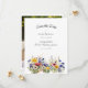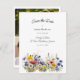 Boho Chic front with colorful, watercolor blue, red, yellow and white wildflower border with a splash of gold on white background. On back, a modern 3 photo collage for photos of the couple. All templates provided to make this easily ready for getting ready for your special day.