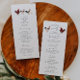 Rustiskt bröllopsprogram med vattenfärgad illustration av kycklingar. Information om ceremonin i bröllop och bröllopsfestens namn finns med i detta program.