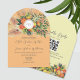 Denna vibrerande inbjudan till citrusbröllop med boho har en modern, bågformad form med lush-vattenfärgbilder av orangar, citroner och grönska. Den främre konstruktionen omfattar elegant namn och en vapensköld i monogram, inramad av pampasgräs och tropisk bladverk - perfekt för sommar- eller destinationsbröllop. Baksidan har ett samordnat QR-avsnitt för OSA med en lätt citronbakgrund för enkla gästsvar. Ett trendig och ett uppfriskande val för par att planera ett roligt, naturinspirerat bröllop med lite medelhavsluft. Helt anpassade.