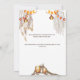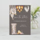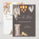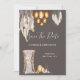 En underbar och livfull illustration med vackra makraméfjädrar som hänger bredvid en glittrande korglyskronasimulator i flätad korg. En ensam trästol draperad med mjuk, genomskinlig tyg, orkidéer, anemoneblommor och boho-fjädrar har ett ljusstake i stål/metall och ovala upprätta ljusstakar i flätad korg bredvid sig som ser ut att lysa, placerade mot en dunkel kolbrun bakgrund. Denna eleganta och stilfulla design är idealisk för rustika höstbröllop; för sommar-, vår- och höstbröllop; för "save the date"-inbjudningar till afrikansk safari eller vintertema.
