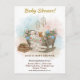 • A sweet watercolor design featuring a lamb, bunny, and bear nestled in a rustic wooden rocking crib draped with lace and decorated with pink and blue florals. Hanging dream catchers complete this charming boho-themed baby shower.